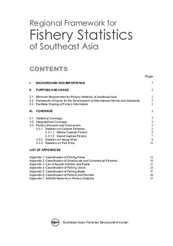 Southeast Asian countries as harmonized framework for compilation of regional fishery statistics from 2008 onwards. The framework also serves as a minimum requirement for countries in collection of fishery statistics to support policy, planning and management of fisheries.