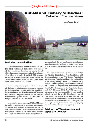 This paper summarizes the outputs of the Regional Consultation on Fisheries Subsidies organized by ASEAN-SEAFDEC in Bangkok, Thailand 9-10 October 2003. In preparation for the meeting all ASEAN member countries were requested to complete a questionnaire on available subsidies within their fishery sector and the data were compiled using a matrix with categories and types of subsidies listed as indicated in two documents of the WTO and FAO.